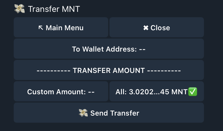 * **Transfer Amount** - Enter a custom amount, or choose to send all MNT from the wallet.